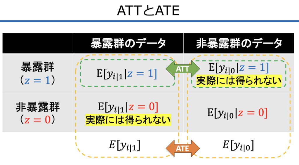 この図は、ATEとATTが統計学的に「どの部分の差」を見ようとしているのかを表しています。ここで最も重要なのは、黄色いマーカーで「実際には得られない」と書かれている部分(反事実)の存在です。