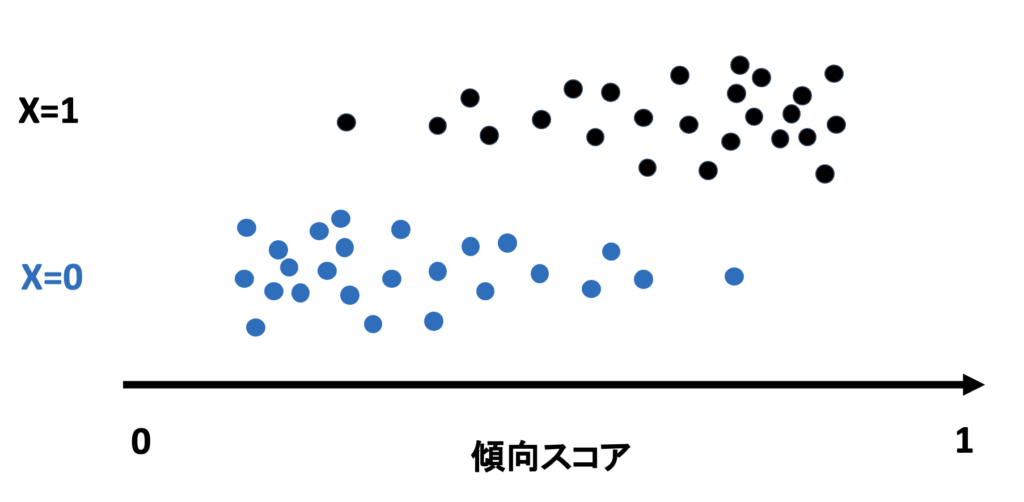 このように、傾向スコア(なりやすさ)に偏りがあるため、そのまま比較するとバイアスがかかってしまいます。上下でドットの位置がずれているのが分かります。