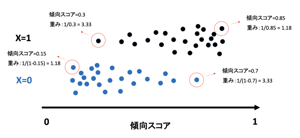 これは、傾向スコア(介入を受ける確率)の逆数を重みとしてデータに掛ける方法です。