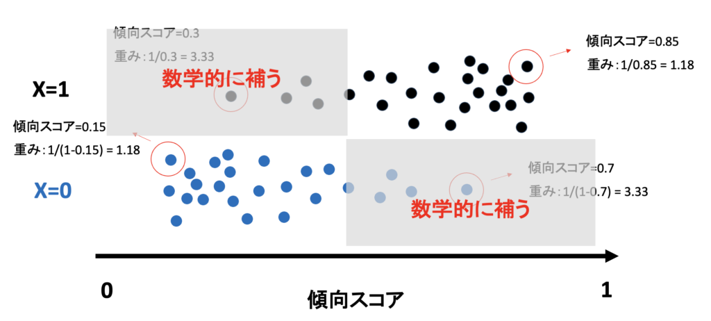 • レアな人ほど、重みを大きくする:例えば、X=1(介入群)の中に、傾向スコアが0.3と低い(本来なら介入を受けにくい)人がいたとします。この人は「レアな存在」です。そこで、確率の逆数(1/0.3)を計算し、この1人のデータを「3.33人分」に膨らませて扱います。