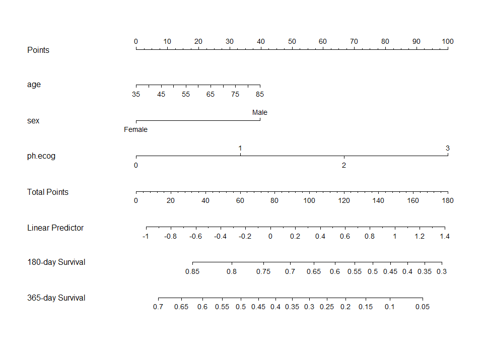 fit <- cph(Surv(time, status) ~ age + sex + ph.ecog,