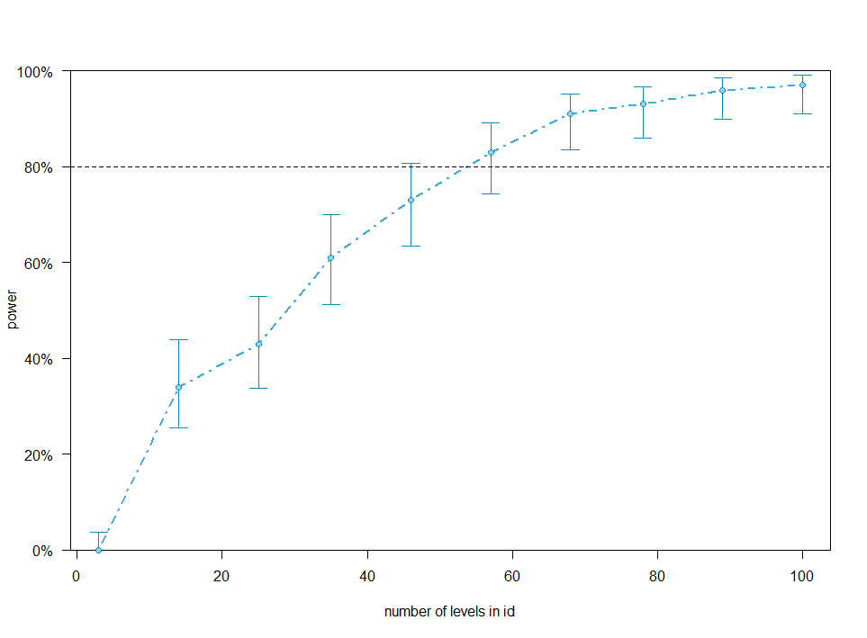 pc <- powerCurve(model_ext, test = fixed("time:groupOld", "t"), along = "id", nsim = 100)