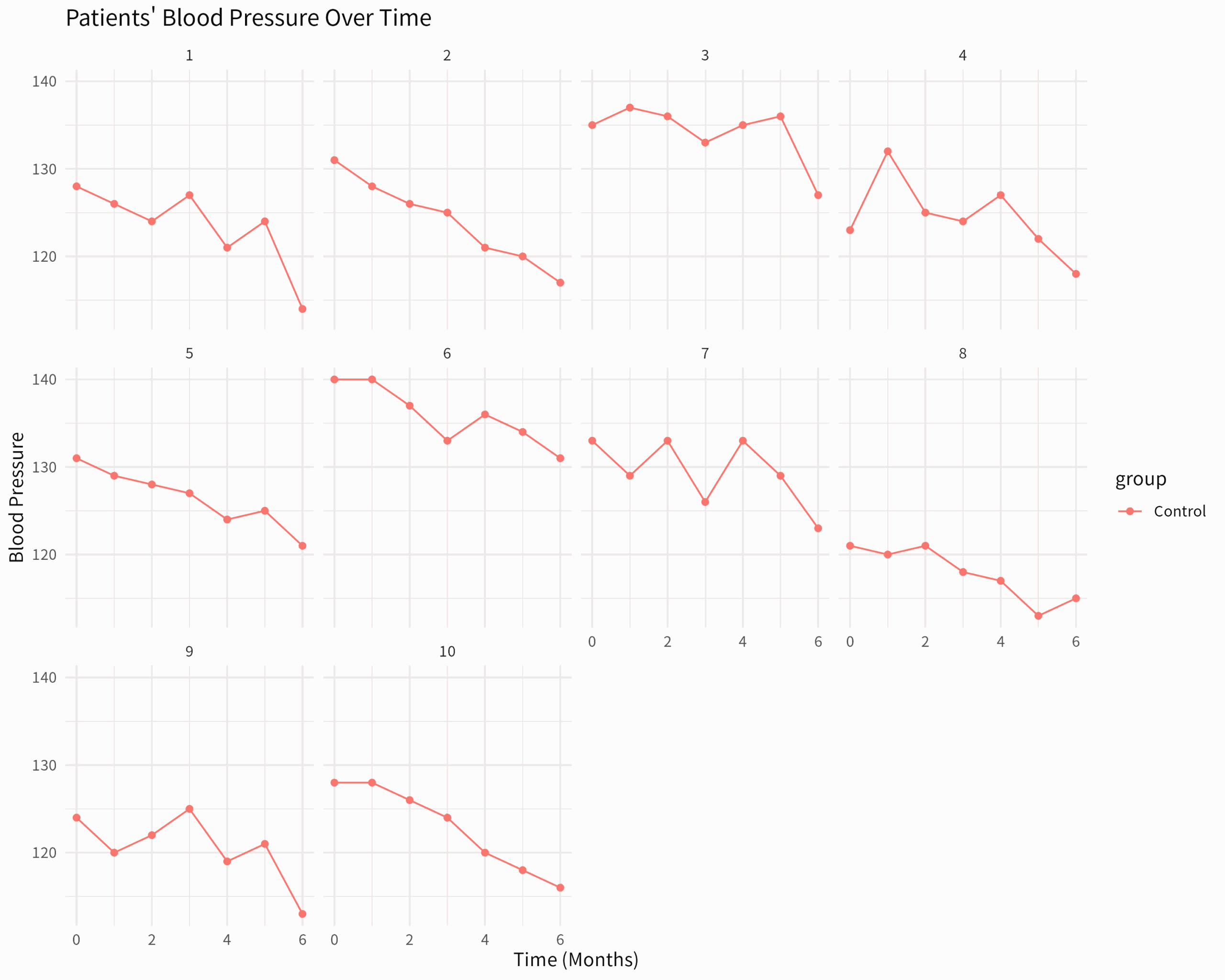 labs(title = "Patients' Blood Pressure Over Time", x = "Time (Months)", y = "Blood Pressure") +