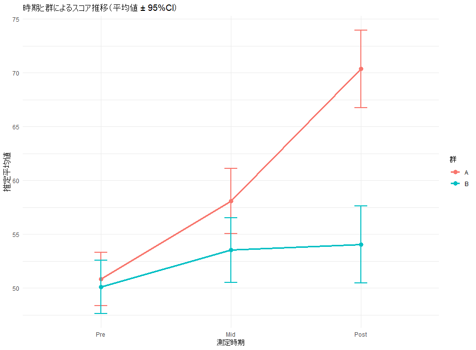 labs(title = "時期と群によるスコア推移(平均値 ± 95%CI)",